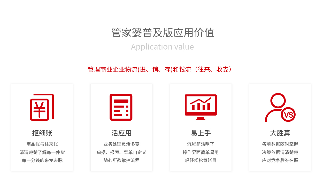 管家婆辉煌普及版——成长型企业的好帮手 2021/04/01 管家婆通用软件 辉煌系列 2347 0 成长型企业的好帮手 管家婆辉煌系列软件 管家婆普及版是一款深受广大中小企业欢迎的进销存、财务管理一体化软件。该软件充分考虑了国内的中小企业规模不大、人手不足的实际情况,采用独特的“傻瓜式财务”理念设计,操作简单、人人易用,只要懂生意就能全面管账。南通管家婆软件有限公司提供全程技术支持。申请试用 如何选择管家婆软件辉煌系列