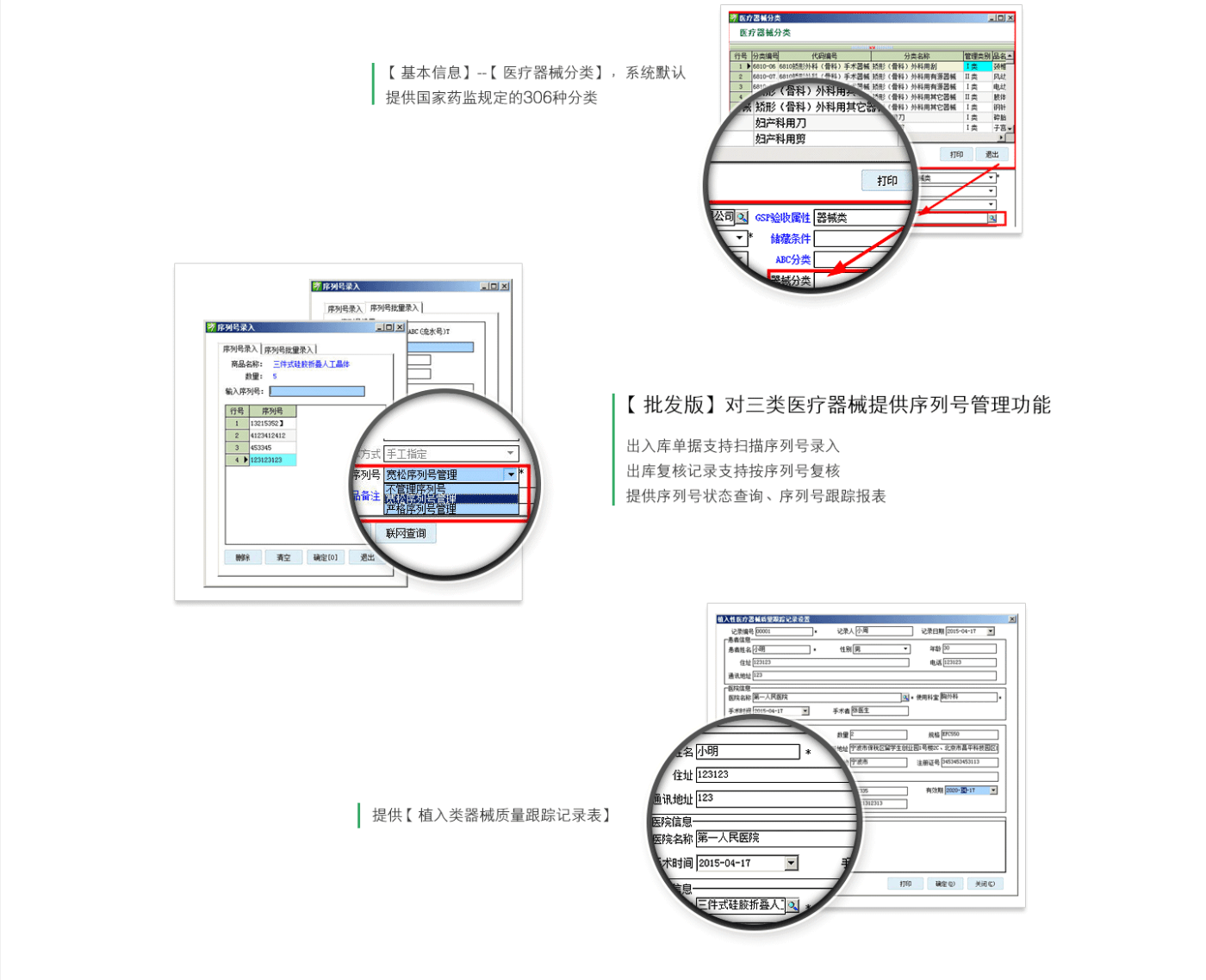 对三类器械提供完备序列号管理模式,支持严格序列号、宽松序列模式供客户选择。序列号贯穿于采购、库存、销售等多个业务流程中,在入库时,录入号后,将与批次关联,在销售、出库时,可直接扫描序列号,自动选择批次。可通过序列号准确查询出相关的业务数据。