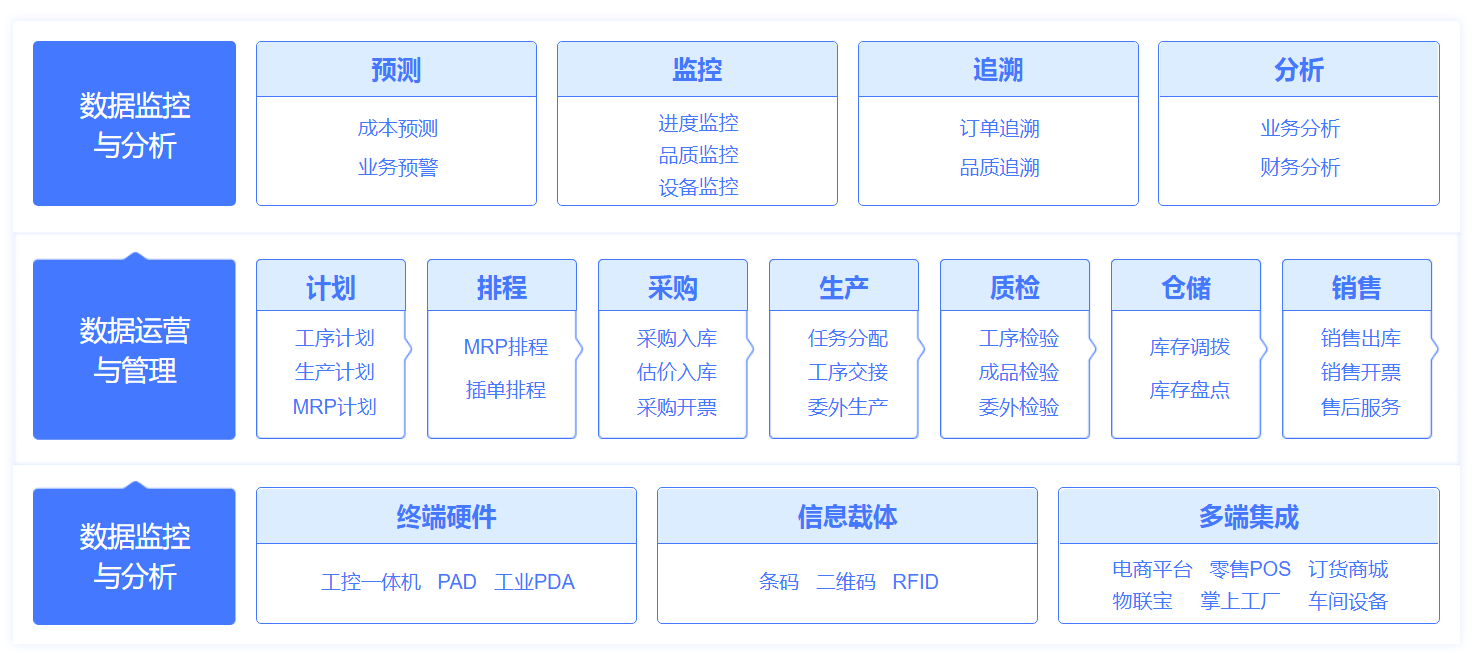 全面管理生产资料、生产计划、排程、车间生产、质检和完工入库等全流程