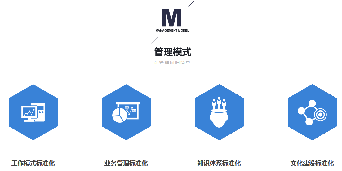 作为国内第一个针对企业组织运营管理的“咨询-培训-软件”提供商,旨在帮助企业通过“管理培训+管理咨询+管理软件”,实施规范化、 标准化建设,推动企业实现4个现代化(复杂问题简单化、简单问题流程化、流程问题标准化、标准问题信息化),解放一把手,《每周只到公司一天》,最 终实现《局外管理》,做到事业成功、人生成功。