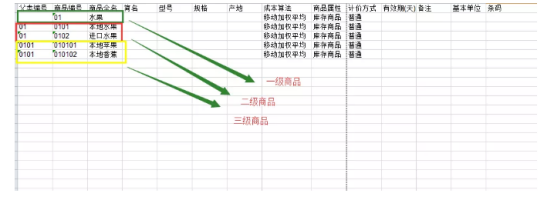 在大类商品编号为01,名称为水果,把水果进行分类,分为本地水果和进口水果,商品编号0101,商品名称为本地水果,和编号0102,商品名称进口水果。