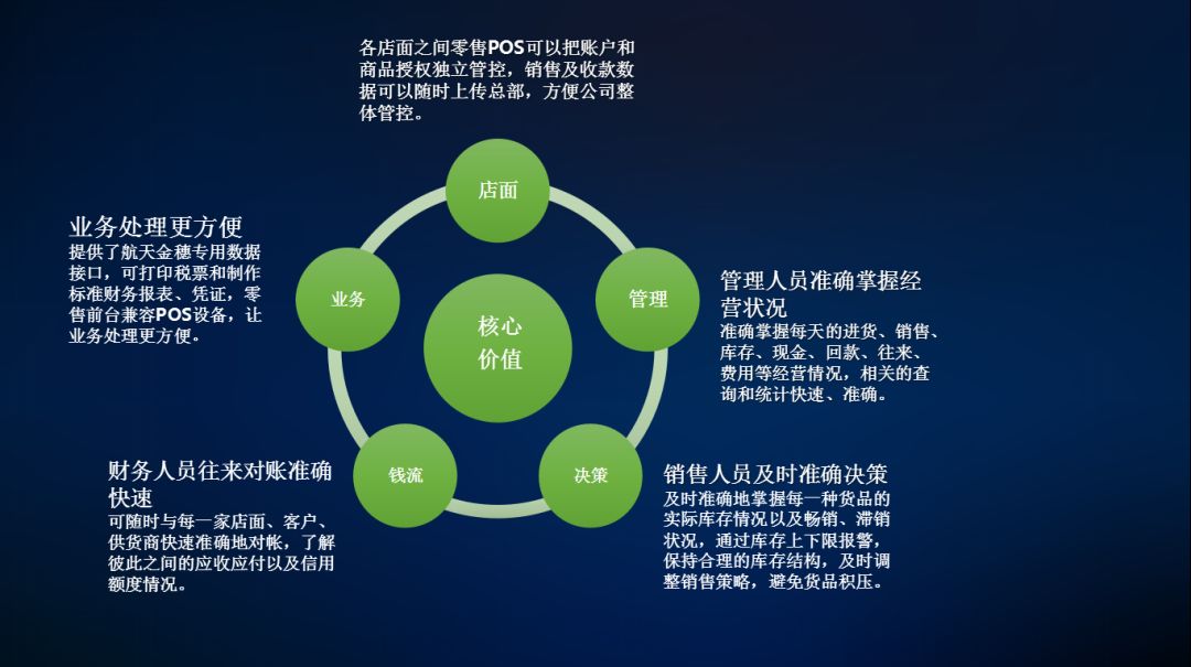 前后台一体化:可实现后台统一设置商品(含组合商品)、会员、价格策略、促销策略、操作员权限,并统一分发到门店零售POS终端;
