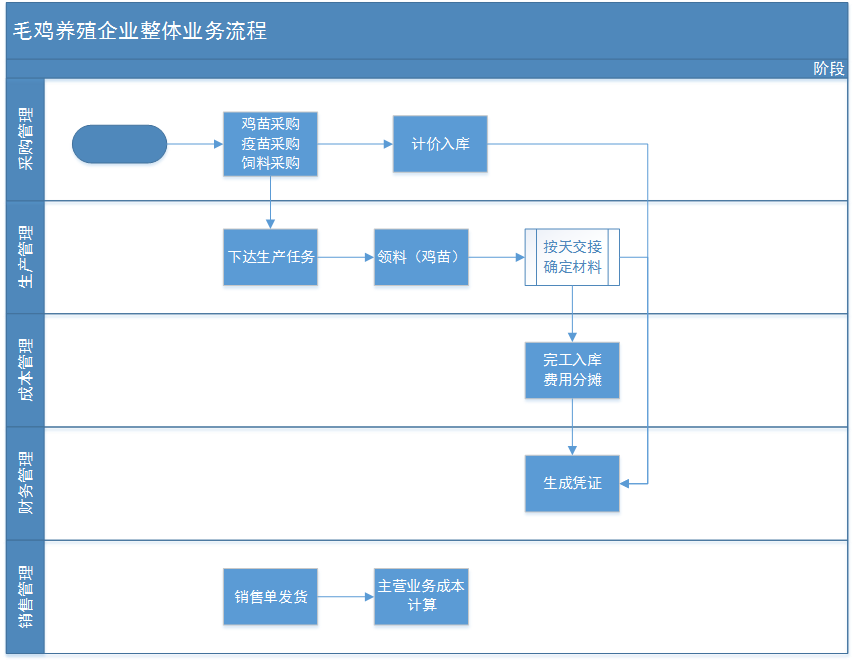 毛鸡养殖企业希望通过生产过程记录每天的一个饲料费用发生情况,并将这些费用分摊到成本里边去,月末将人工费用同时分摊进去,同时因死亡而产生的物料消耗也同时摊入到剩下的正常毛鸡中去。从而核算到每个批次鸡苗到毛鸡出厂的全部成本。