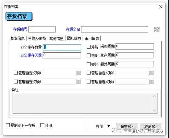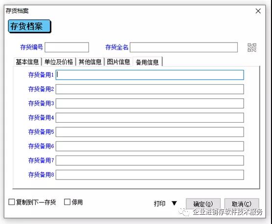 17、 备用信息:存货的其它数量,系统不能涵盖到的,可以加到这里面,最多可以增加8个存货属性。
