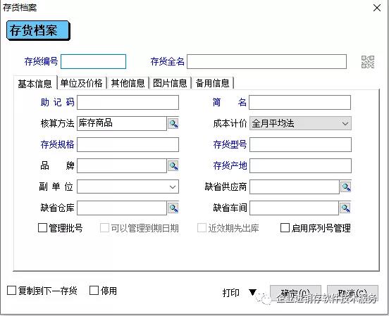存货档案共涉及到里5个部门,基本信息、单位及价格、其他信息、图片信息、备用信息。其中所有蓝色字体,双击时可以更改名字。