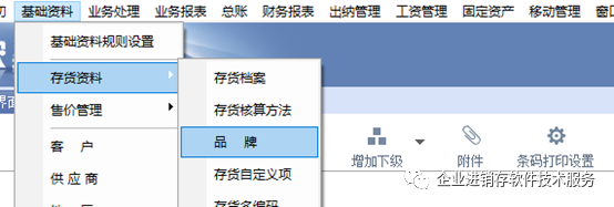 7、品牌:可以单独对产品进行品牌分类,如果需要查询各个品牌的销量,此处品牌需要填写。具体维护品牌位置如下图