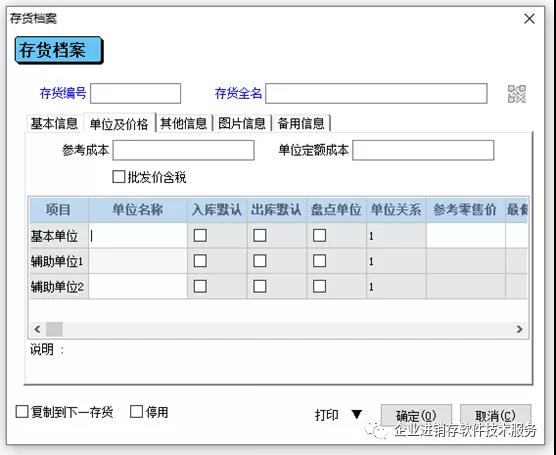 12、 基本单位:存货的单位名称,对入库、出库默认打勾,说明在入库、出库时使用此单位计数。