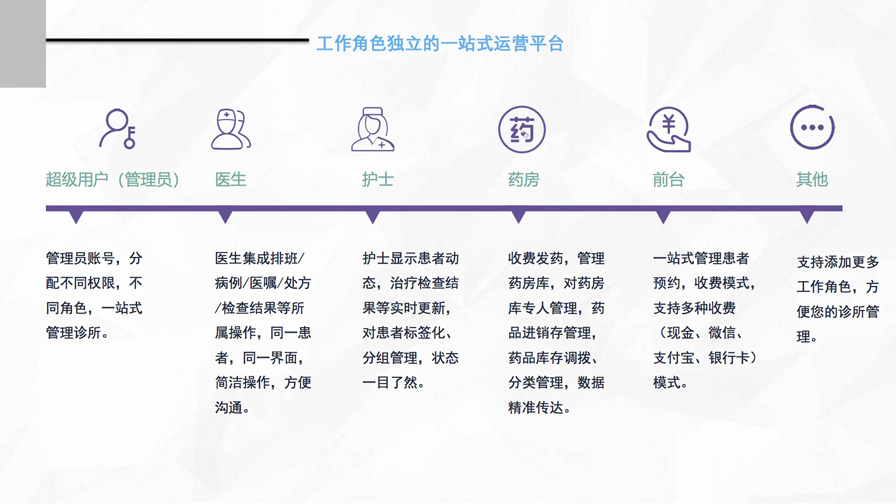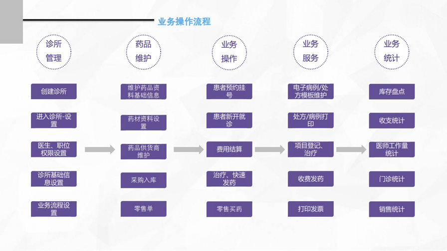 千方百剂云诊所——管家婆软件专供诊所的管理软件 2021/05/06 医药行业 行业分类 4370 0 千方百剂诊所管理系统是针对中国各级城市、乡镇普遍存在的私人个体诊所、社区医院、乡镇卫生室等小型医疗机构量身定做的,集药品进销存、财务统计、电子病历、诊疗服务为一体的专业管理系统。包括进销存管理、往来管理、门诊管理、会员、促销管理、财务管理、效期管理。帮助小型医疗机构实现病员管理、物流、资金流、信息流的一体化管理,全面提升的运营效率。采用云存储服务,数据永不丢失,安全可靠,只需浏览器访问登陆网站即可使用。 南通管家婆软件有限公司24小时服务咨询热线:13912878044。申请试用 诊断流程图: