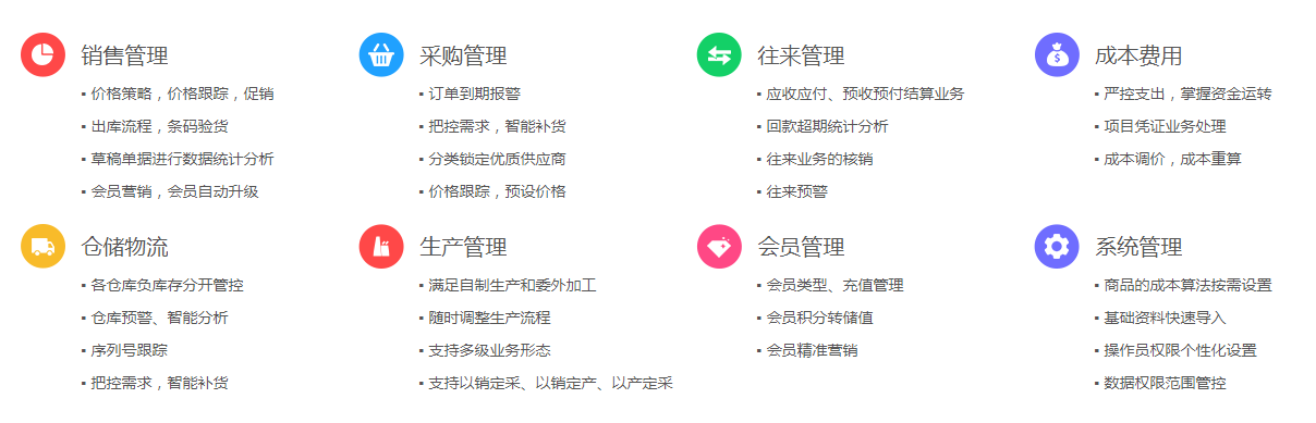 明确、清晰的系统配置;简洁明了的单据数据录入;跨设备、跨平台的用户访问体验;让产品更加易于上手,操作方便、快捷;无论何时、何地都能快速开单、流程管控; 实时有效的掌握企业销售、采购、往来、仓储、费用、收入等经营情况。