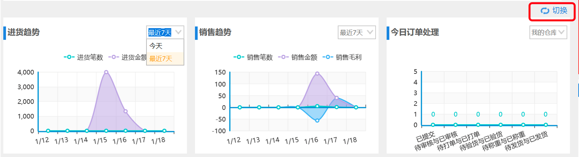 (2)进货趋势:可查看今天或近7天的进货笔数和进货金额。若您只需要查看其中一项,点击上方“进货笔数”或“进货金额”即可。