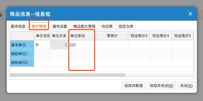 如下所示,若启用完整条码自动生成,则条码组成格式包含:单位条码、商品码、颜色条码和尺码条码、以及商品的自定义字段。