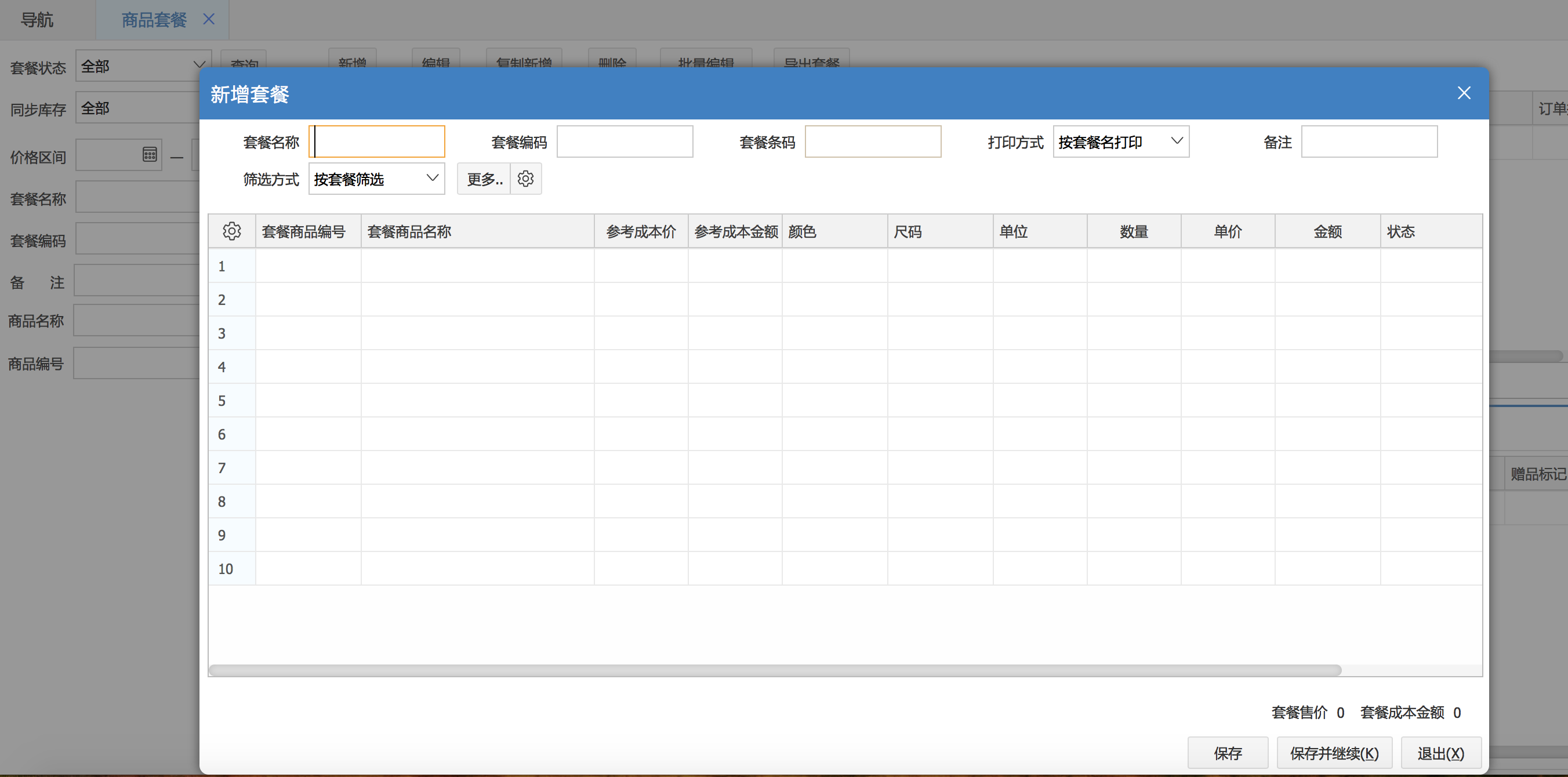 操作路径:【商品】—【商品套餐】,点击【新增】开始创建一个商品套餐: