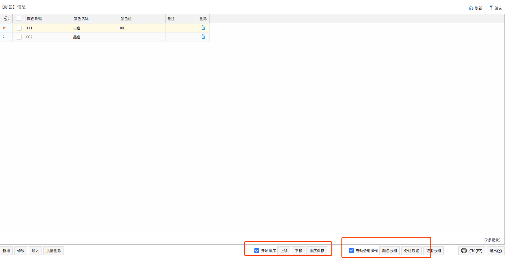 a、可以添加和修改商品颜色信息,包含:颜色名称、颜色条码、备注和颜色分组。