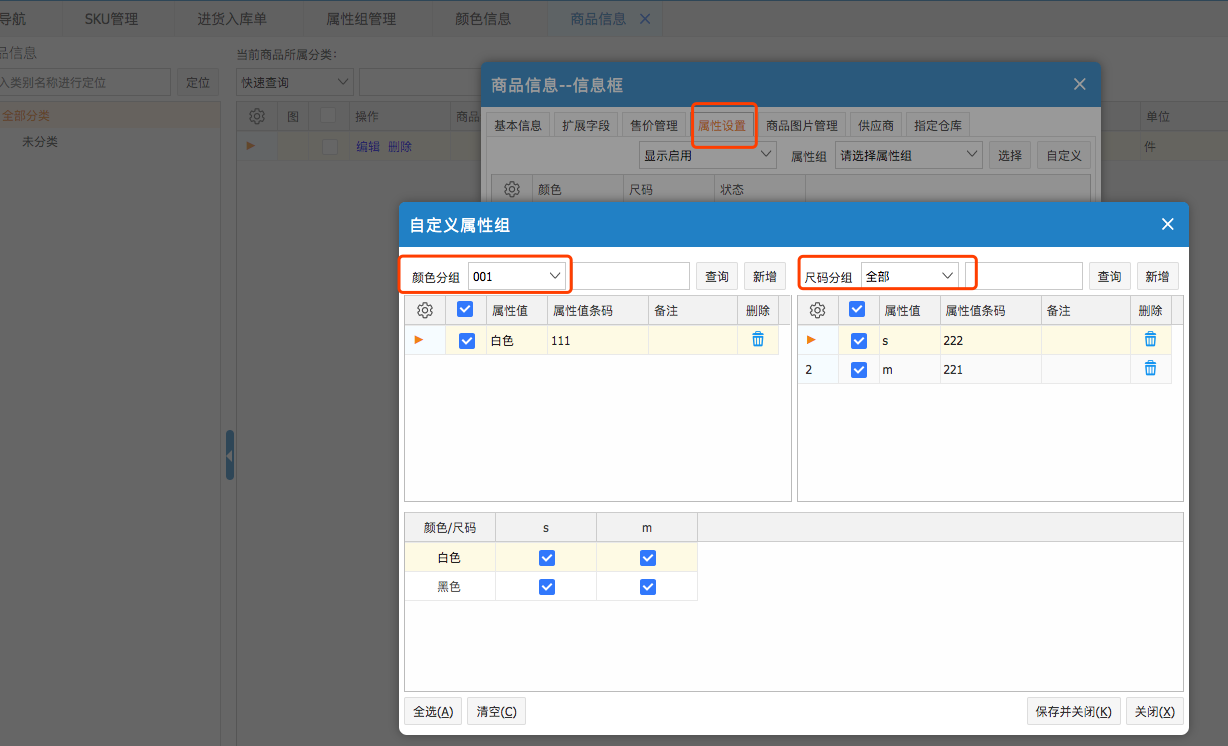 设置商品属性,可以设置属性组和属性信息。用于商品创建时快速设置商品的颜色和尺码