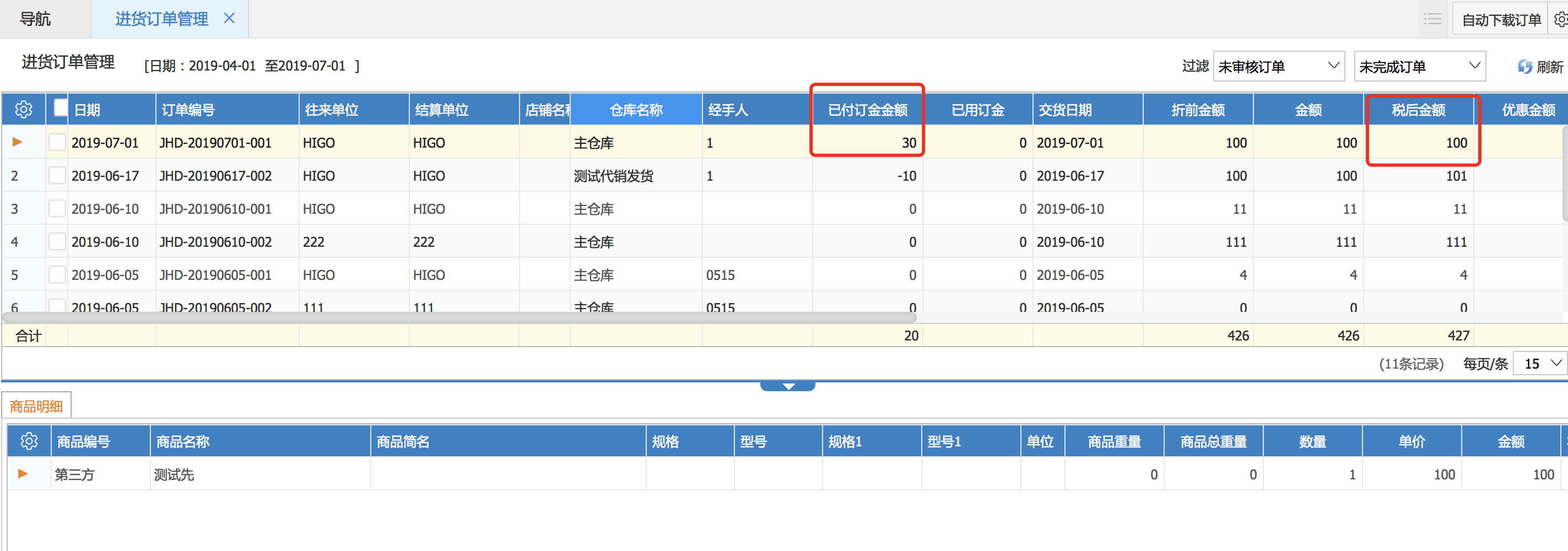 2、进货订单管理:支持查看已付订金金额和已用订金。
