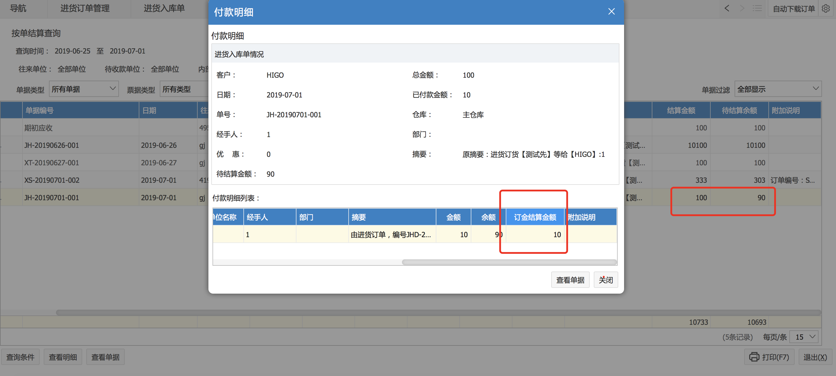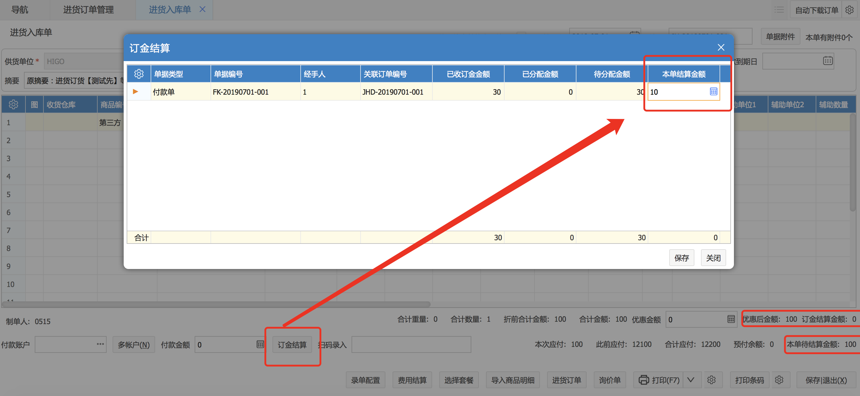3、付款单按单结算扣减订金结算部分:后续对进货入库单付款,按单结算时本单的待结算金额需要扣减订金结算金额。