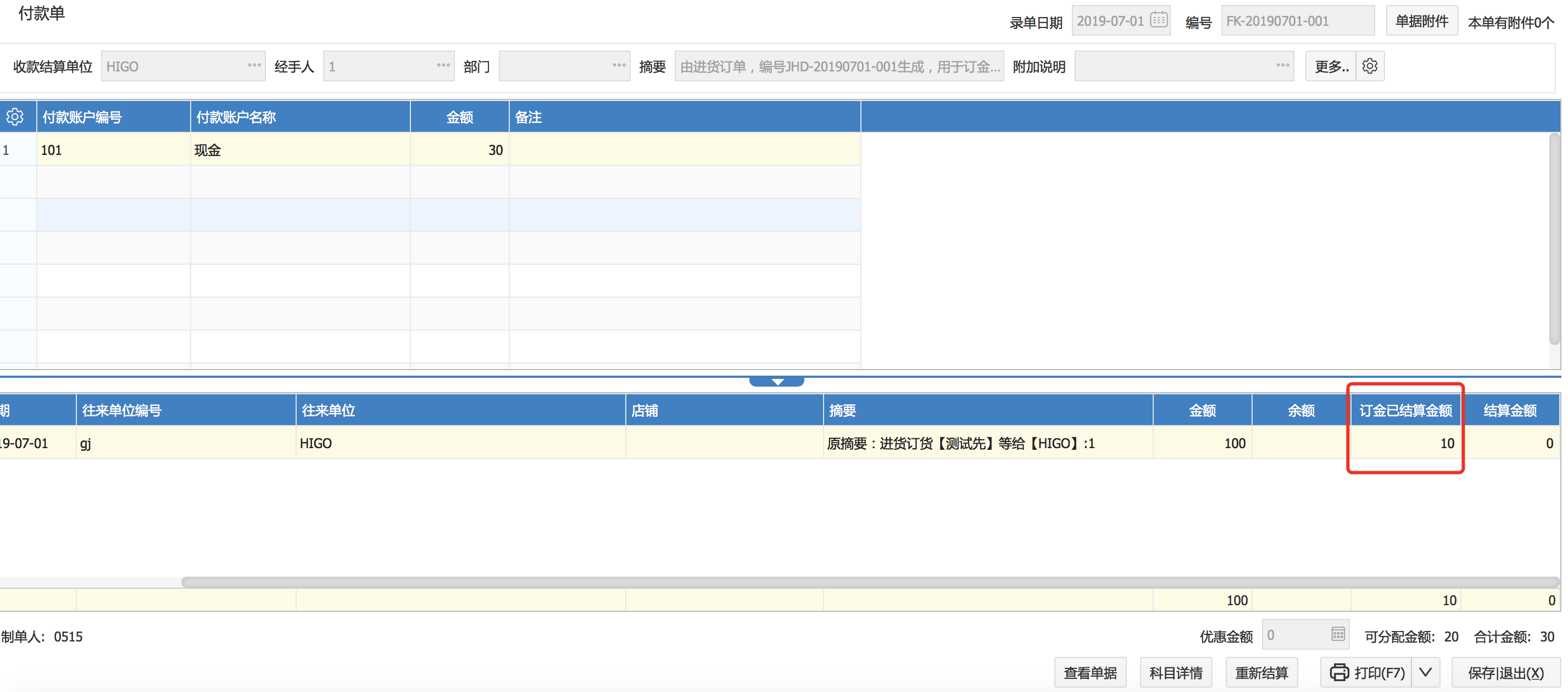 注意:单据下方的本单待结算金额=本次应付-订金结算金额