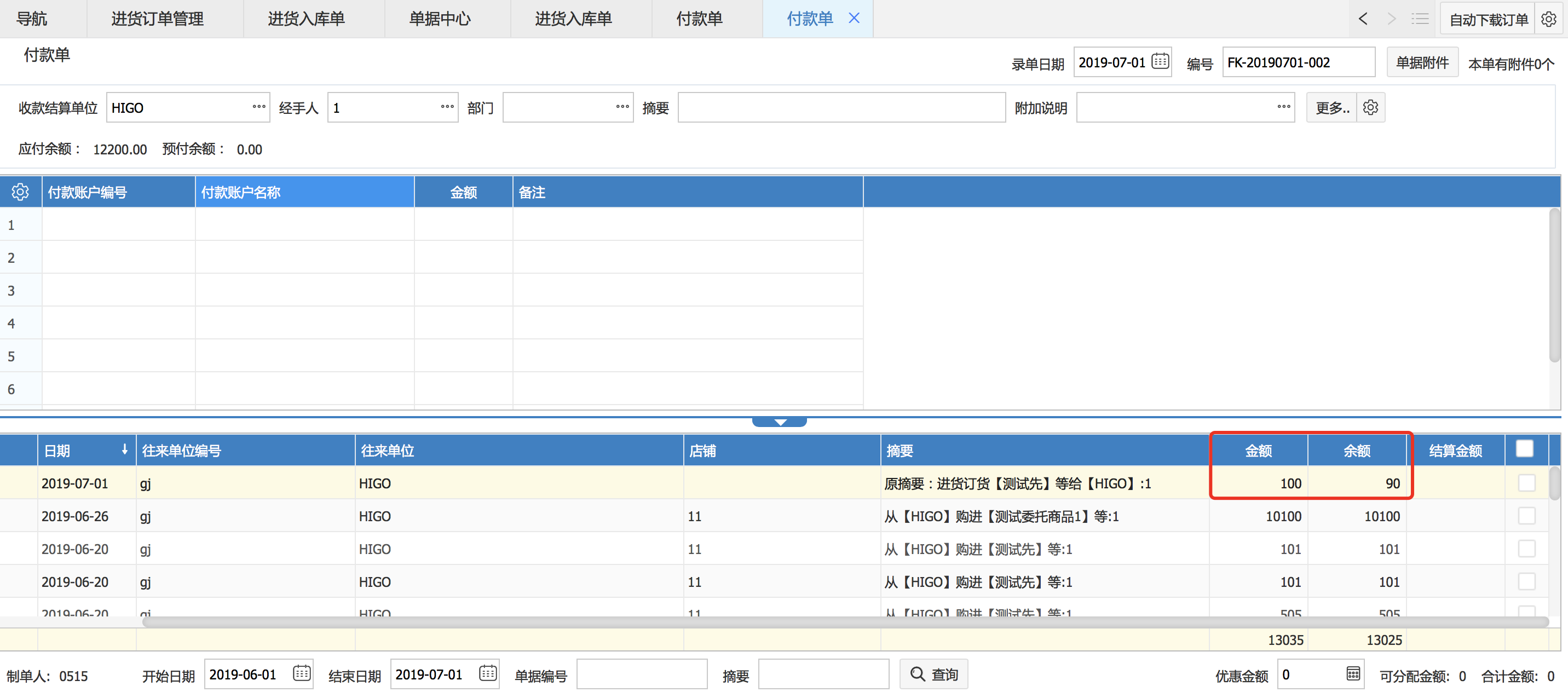 6、后续对这张进货入库单进行付款单按单结算时,本单待结算余额会扣减掉用订金结算的部分