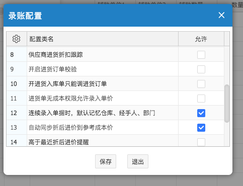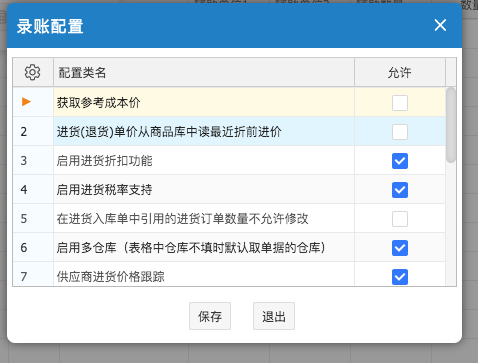 | 9 | 开启进货订单校验 | 启用此配置项,引用订单后,单据列表会多出3列:订货量,完成数量和差值,数量默认为0。可以通过扫描入库的方式去检验本次入库数量和订货数量的差异