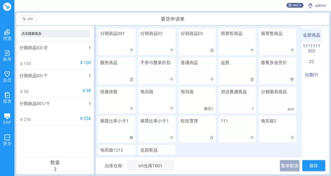门店可直接在POS端创建要货申请单,单据对应条件直接根据管家婆易零售后台【ERP门店配置】中获取默认分支机构、所属仓库、所属部门、默认经手人等信息,只需要选择出库仓库及要货商品即可完成要货申请操作。