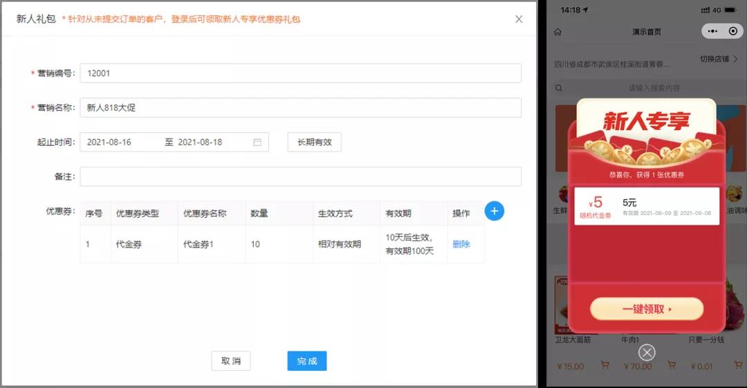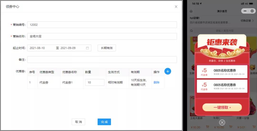 在现有的领券中心下优化创建活动模式,创建领券活动后打开小程序会弹窗显示领券信息,点击即可一键领券。该领券方式可让用户更亲身的体验到优惠,并加大商城流水。
