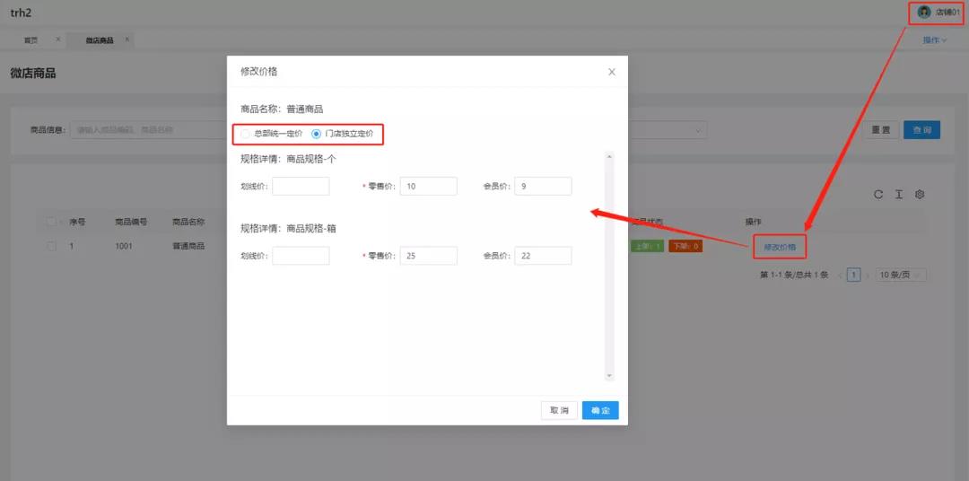 门店视角微店商品可以独立定价,点击修改价格选择【总部统一定价】和【门店独立定价】。