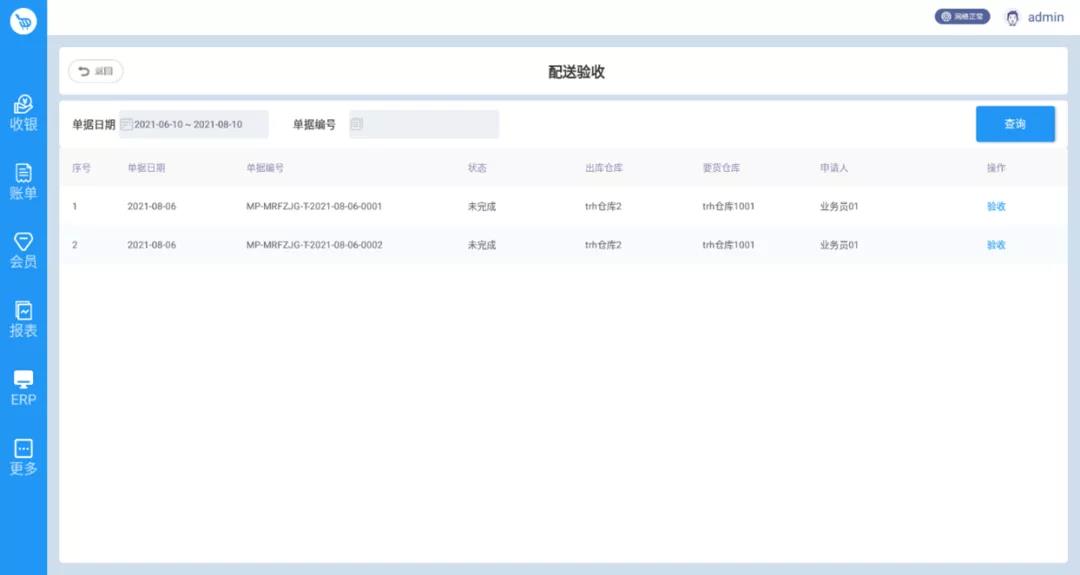 门店在POS端上选择配送验收,将所有该门店对应的仓库选择为要货仓库,且状态为未完成的配送单进行展示,门店选择需要验收的配送单直接填写数量即可完成验收,无需选择过多单据条件,没有繁琐的操作步骤。