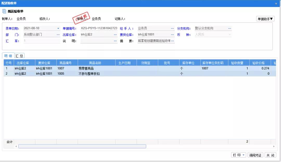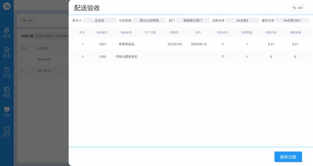 选择需要验收的配送单,点击【验收】,填写验收数量,点击保存过账。