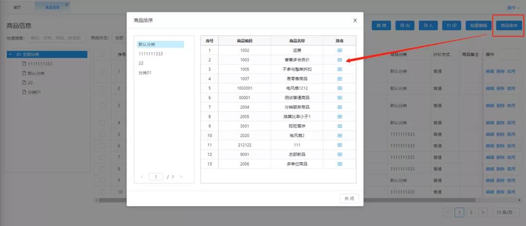 商品信息列表根据时间顺序从前往后排序,增加【商品排序】按钮,可直接使用拖拽商品,对分类下的商品进行排序,从而改变POS端中商品排序的展示。
