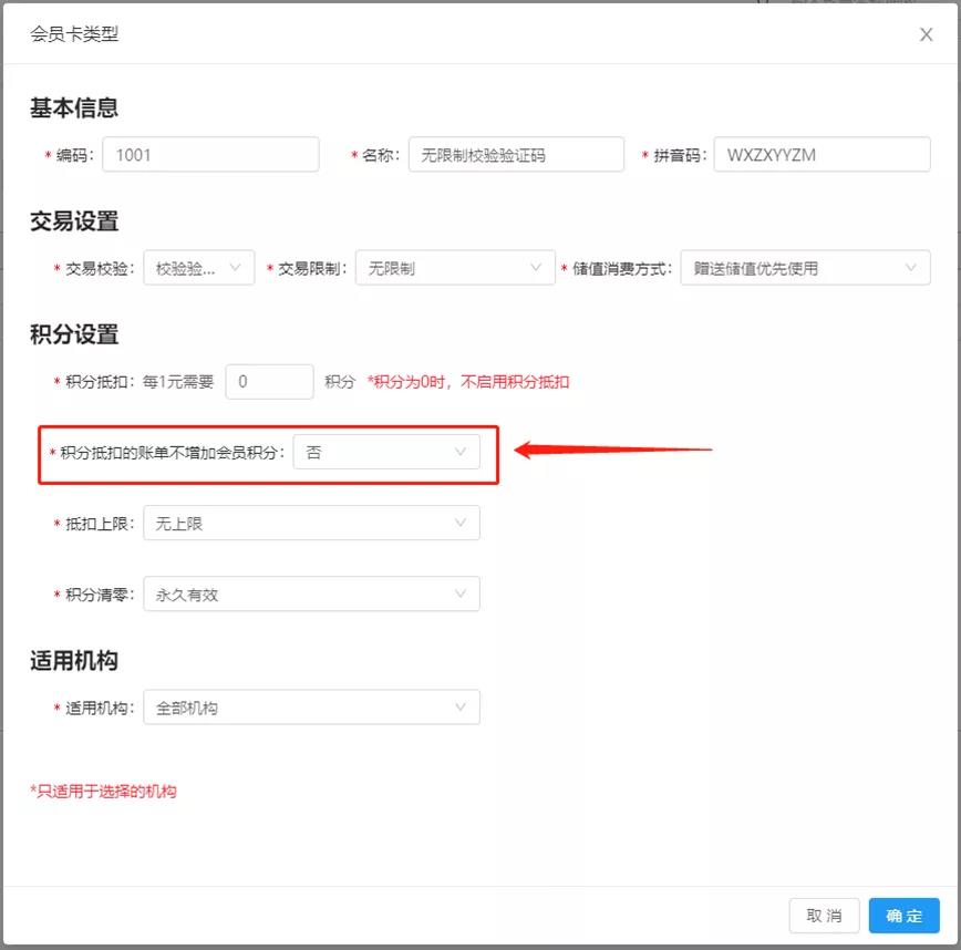 增加选项【积分抵扣的账单增加会员积分】,默认为“是”,选择“否”时 使用积分抵扣的账单不参与会员积分。比如账单100元,其中使用积分抵扣50元或整单都使用积分抵扣100元,该单据产生的金额都不计入会员积分。