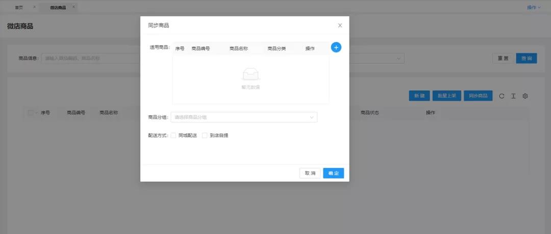 点击按钮,弹窗显示选择商品范围,一次最多同步1000个商品;选择商品时,按商品而不按商品多单位显示,选择后将商品的所有单位规格同步;商品分组–同步到微商城的商品分组;配送方式–同步所有商品的配送方式。