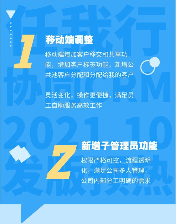 管家婆CRM2021.10版即将发布,新增功能更灵活 2021/10/26 分类:CRM OA资讯 新闻资讯 管家婆资讯 2298 0 为了方便企业对系统各个操作进行精细化管理和监控,管家婆软件协同CRM2021.10版移动端增加客户移交和共享功能,增加客户标签功能,新增公共池客户分配和分配给我的客户,系统灵活变化,操作更便捷,满足员工自助服务高效工作。 新增子管理员功能,权限严格可控,流程透明化,满足公司多人管理,帮助企业细化、分解权限,公司内部分工明确的需求,实现按需“授权到人”。 上一篇: 教程:管家婆进销存软件的历销功能如何使用? 下一篇: 餐饮行业客户管理更需要CRM,让更过流量转为红利