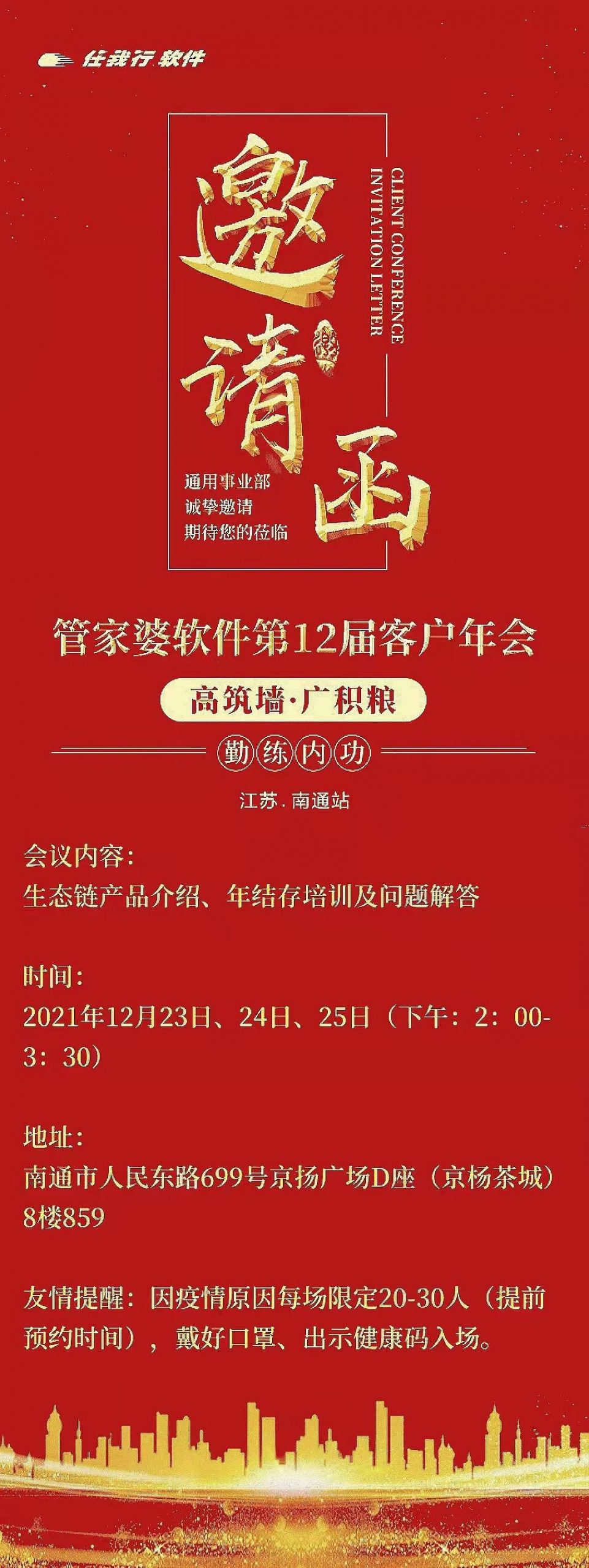 2021管家婆软件第十二届客户年会(江苏.南通站)于2021年12月23日、24日、25日连续三天(下午:2:00-3:30)举行。