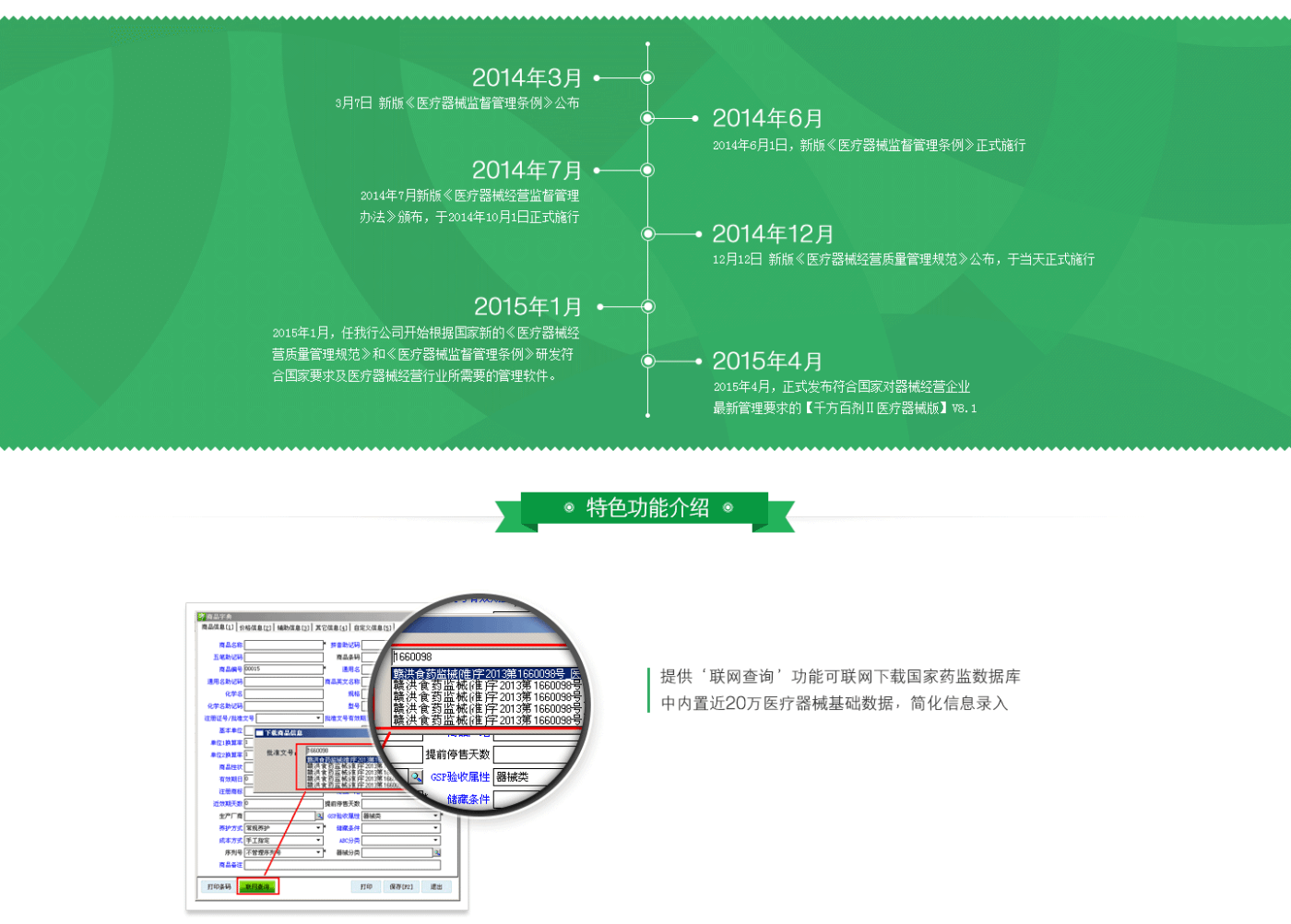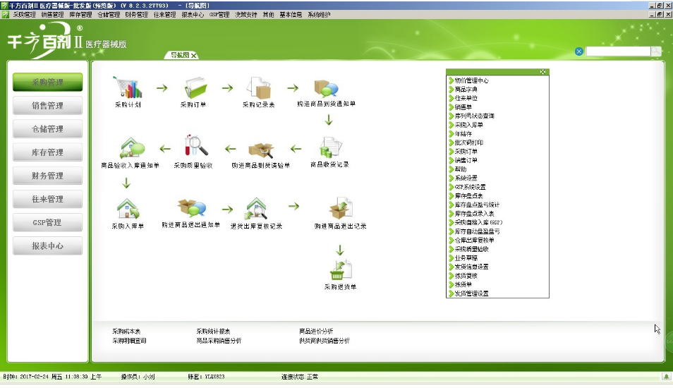 同时提供联网国家药监医疗器械数据库,方便医疗器械信息录入。系统提供包括管理职责、人员与培训、售后付款、设备与设置、检查与验收、储存与养护及出库管理等七大模块的一系列报表200余种,且将进销存、财务和GSP管理有机结合,提供GSP关联设置,对供货单位、购货单位进行证照、经营范围、资质的完全控制实现全程信息化管理。