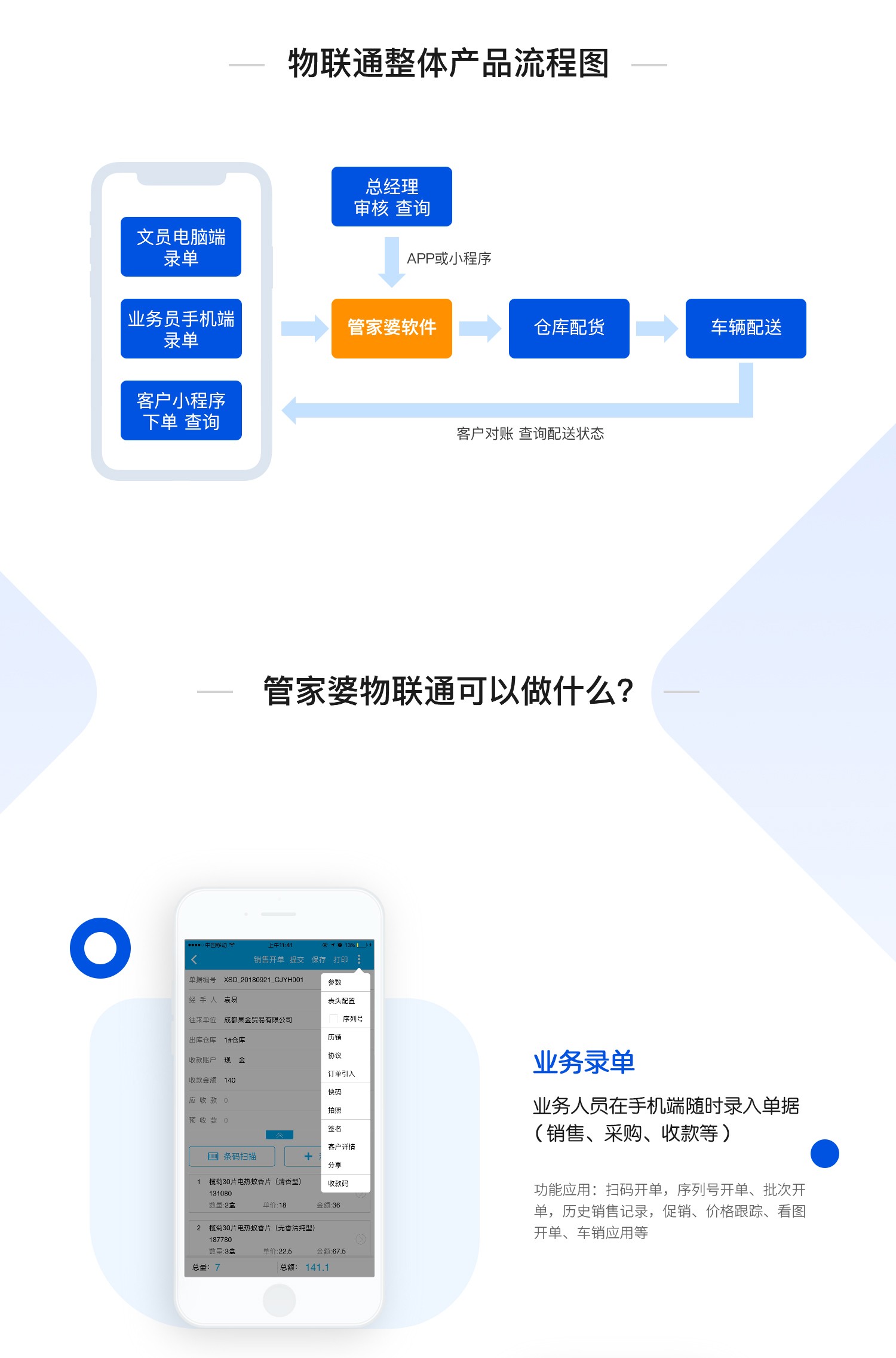 管家婆物联通,是一款可以与管家婆辉煌/分销产品无缝对接的移动管理软件。移动开单、数据查询、外勤管控、业务审批,四大功能全心助力企业提升管理效率,为企业提供完善的移动终端解决方案,让企业信息管理随时随地都可以进行。