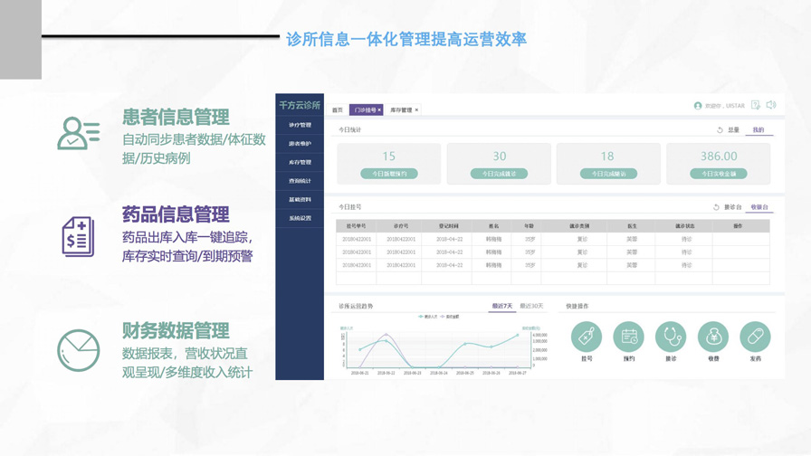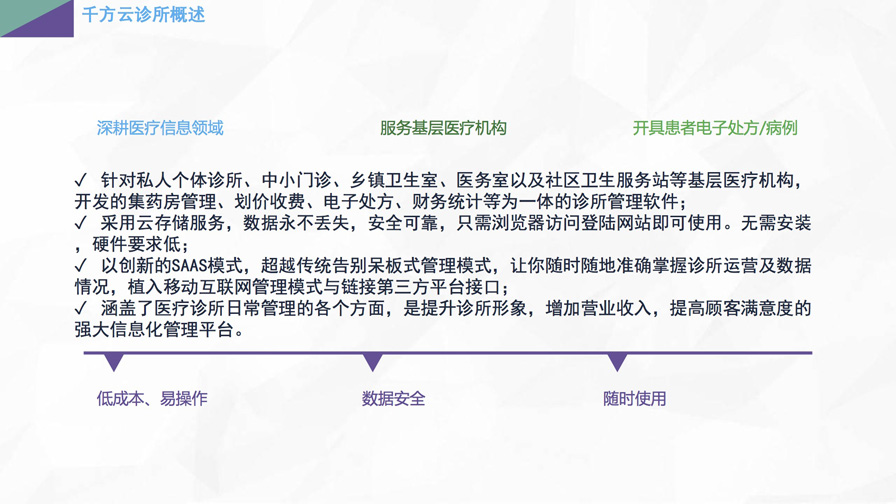 软件介绍相关软件相关文章千方百剂诊所管理系统是针对中国各级城市、乡镇普遍存在的私人个体诊所、社区医院、乡镇卫生室等小型医疗机构量身定做的,集药品进销存、财务统计、电子病历、诊疗服务为一体的专业管理系统。包括进销存管理、往来管理、门诊管理、会员、促销管理、财务管理、效期管理。帮助小型医疗机构实现病员管理、物流、资金流、信息流的一体化管理,全面提升的运营效率。采用云存储服务,数据永不丢失,安全可靠,只需浏览器访问登陆网站即可使用。 诊断流程图: 挂号功能: 医生诊断: 病历管理: 医生病人销售汇总表: 南通管家婆软件有限公司是管家婆软件五星级总代理及授权营销服务中心,是管家婆软件全国首批授权服务中心之一,拥有多年管家婆软件实施,服务团队。15年来为南通地区近万家企业进行了信息化改造及管理系统的导入,为用户提供优质的本地化服务随着用户的业务拓展和管理升级,不用担心功能不够用,我们支持数据无缝升级到管家婆辉煌所有系列产品,让用户没有后顾之忧。 南通管家婆软件有限公司主营产品线覆盖管家婆进销存、财务软件、 生产管理软件、ERP软件,CRM、OA、电子商务和移动互联产品、软件个性数据图表定制,数据分析,数据大屏,智慧校园,智能客服平台为客户提供信息化建设一站式解决方案,协助企业多维度管理,经营需求。 南通管家婆软件有限公司24小时服务咨询热线:13912878044。 上一篇: 管家婆辉煌五金建材版——五金建材批发零售行业一体化软件 下一篇: 千方百剂农兽药管理软件——农资商贸企业信息化解决方案