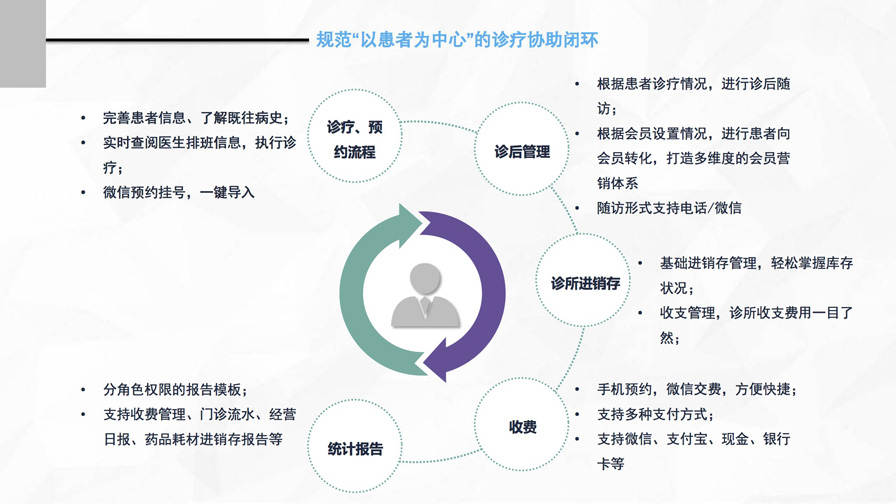 千方百剂云诊所——管家婆软件专供诊所的管理软件 2021/05/06 医药行业 行业分类 4370 0 千方百剂诊所管理系统是针对中国各级城市、乡镇普遍存在的私人个体诊所、社区医院、乡镇卫生室等小型医疗机构量身定做的,集药品进销存、财务统计、电子病历、诊疗服务为一体的专业管理系统。包括进销存管理、往来管理、门诊管理、会员、促销管理、财务管理、效期管理。帮助小型医疗机构实现病员管理、物流、资金流、信息流的一体化管理,全面提升的运营效率。采用云存储服务,数据永不丢失,安全可靠,只需浏览器访问登陆网站即可使用。 南通管家婆软件有限公司24小时服务咨询热线:13912878044。申请试用 诊断流程图: