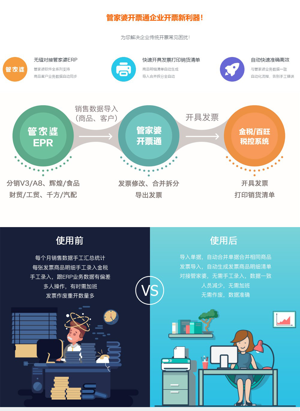 管家婆开票通:无缝对接管家婆软件和金税/百旺税控开票系统,准确、快速、高效开具发票,打印销货清单,让企业开票业务处理更轻松!